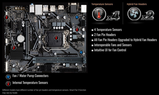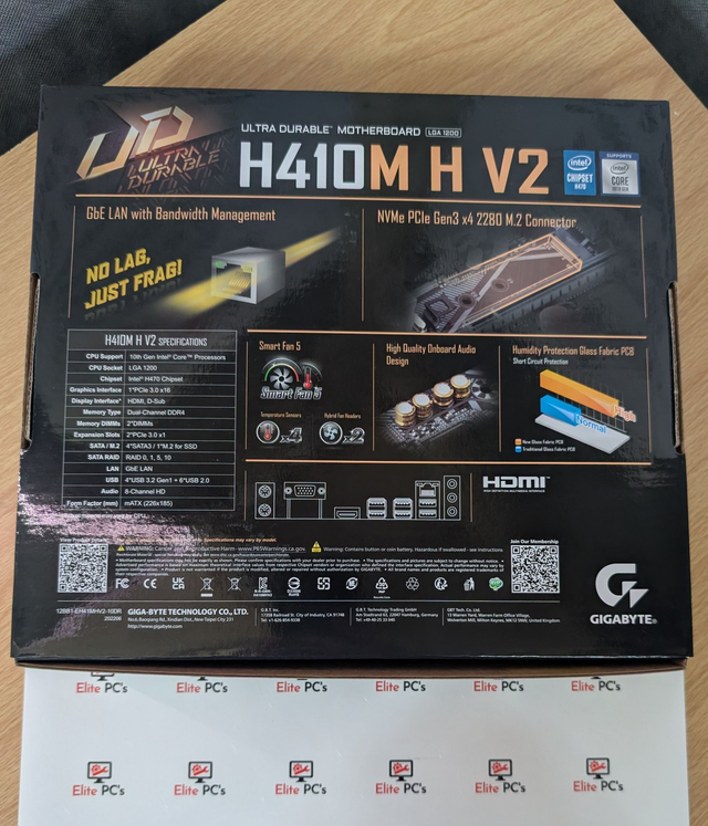 The Gigabyte H410M H V2 motherboard supports 10th Gen Intel Core processors (LGA1200 socket) and features dual-channel DDR4 memory support up to 64GB at 2933MHz. It offers versatile storage options with one PCIe Gen3 x4 M.2 slot and four SATA 6Gb/s ports. The Intel GbE LAN ensures stable network connections, while the 8-channel HD audio provides immersive sound. With Smart Fan 5, this board allows customized cooling via hybrid fan headers and multiple temperature sensors. Built to last, it includes anti-sulfur resistors and glass fabric PCB for enhanced durability. The GIGABYTE APP Center grants easy access to utilities like EasyTune™ and @BIOS, improving user experience.